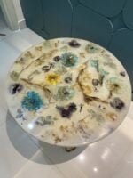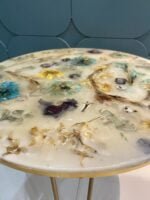 - Materials: Epoxy resin, real flowers and botanicals, metal legs