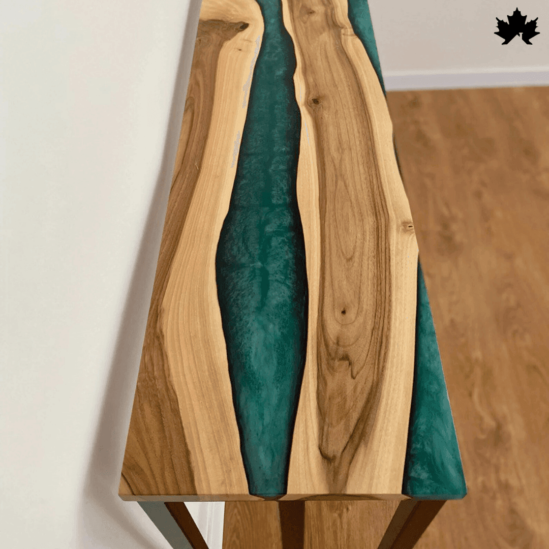 Add a touch of nature-inspired elegance to your home with the Emerald River Resin Console Table, featuring rich green resin flowing through the natural wood grain for a striking, organic design.