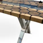 Embrace modern aesthetics with the Geometric Grace Coffee Table, featuring a unique hexagonal wooden design accented by clear resin inlays, perfect for contemporary interiors.