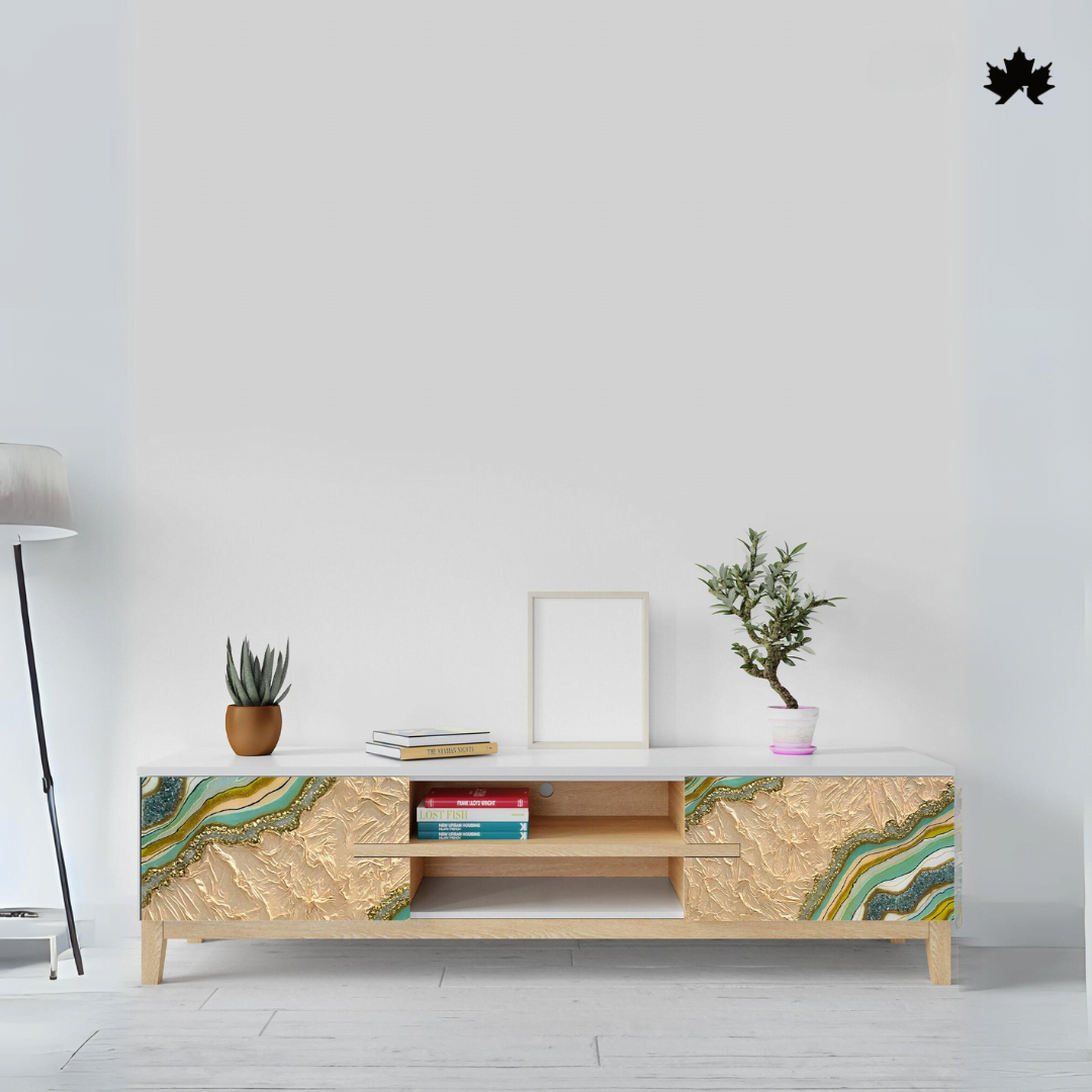 The “Golden Geode” credenza is a masterpiece of interior artistry, a fusion of natural inspiration and opulent design. Boasting a facade that evokes the intricate details of a geode, this credenza shines with swirls of gold, jade, and ivory. The hand-finished golden sections catch the light to add a dynamic sparkle to your room, while the practical layout offers generous storage. Each piece is a unique testament to luxurious living and is crafted to become the crown jewel of your space.