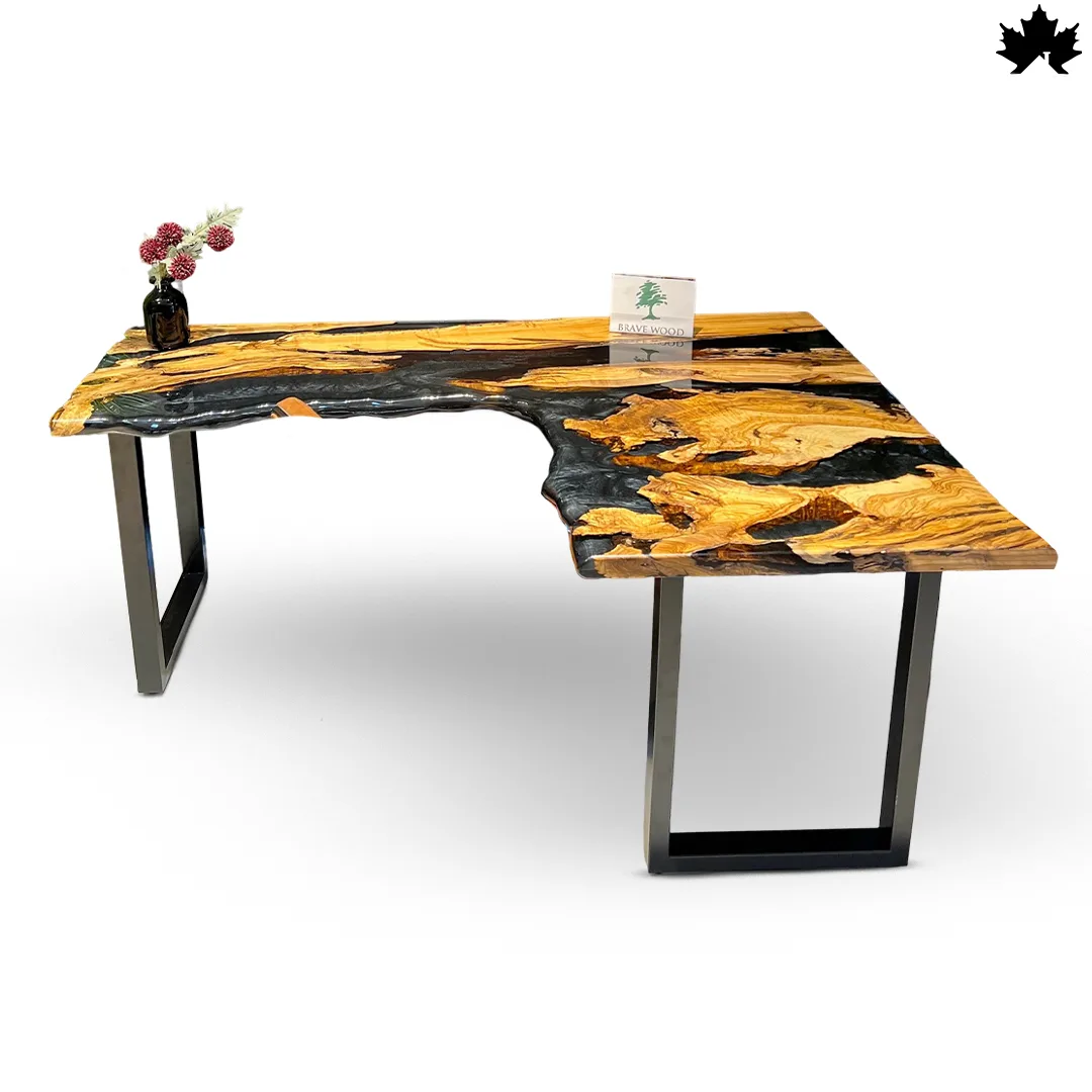 The Lava Flow Executive Desk is part of Fankaarlok’s Signature Series, crafted to bring the raw beauty of nature into the sophisticated workspace. Featuring an eye-catching black resin stream that mimics a lava flow, set against vibrant, golden wood grains, this lava flow executive desk stands as a testament to unique craftsmanship and style.