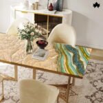 Introducing the Opulent Harmony Elegant Designer Dining Table from Fankaarlok, a masterpiece meticulously crafted to enhance the aesthetics of your dining area. This 5×3 feet designer table showcases a unique blend of rich, colorful resin streams set against a luxe golden backdrop, creating an eye-catching visual appeal that captivates all who gaze upon it. Perfect for those who appreciate the art of fine dining and sophisticated living, this table guarantees to be the centerpiece of many memorable gatherings.